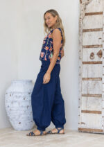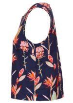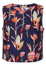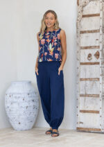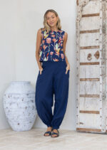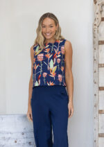 Experience the ultimate in comfort with our Boxy Top in the Birds of Paradise print – featuring striking pink and green native florals on a navy blue base. Made from breathable 100% cotton, the sleeveless design is perfect for those warmer days. The straight edges of this top give it a relaxed fit that sits above the hips, with bust darts to give some shape at the top, and a round neckline with a button at the nape of the neck make for ease when dressing. Pair this top with a skirt or try Acapulco Pants Navy, like our model.