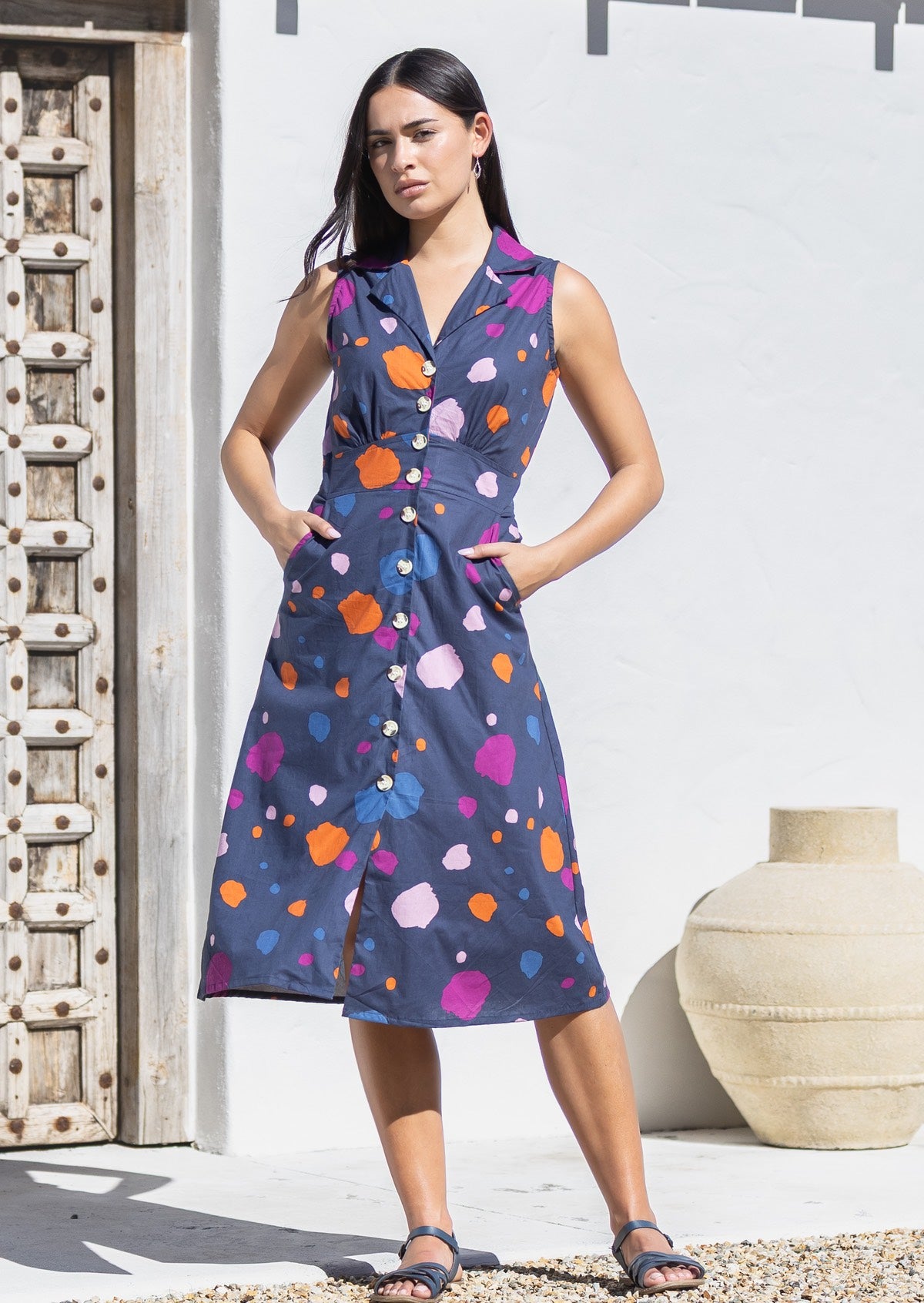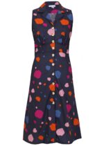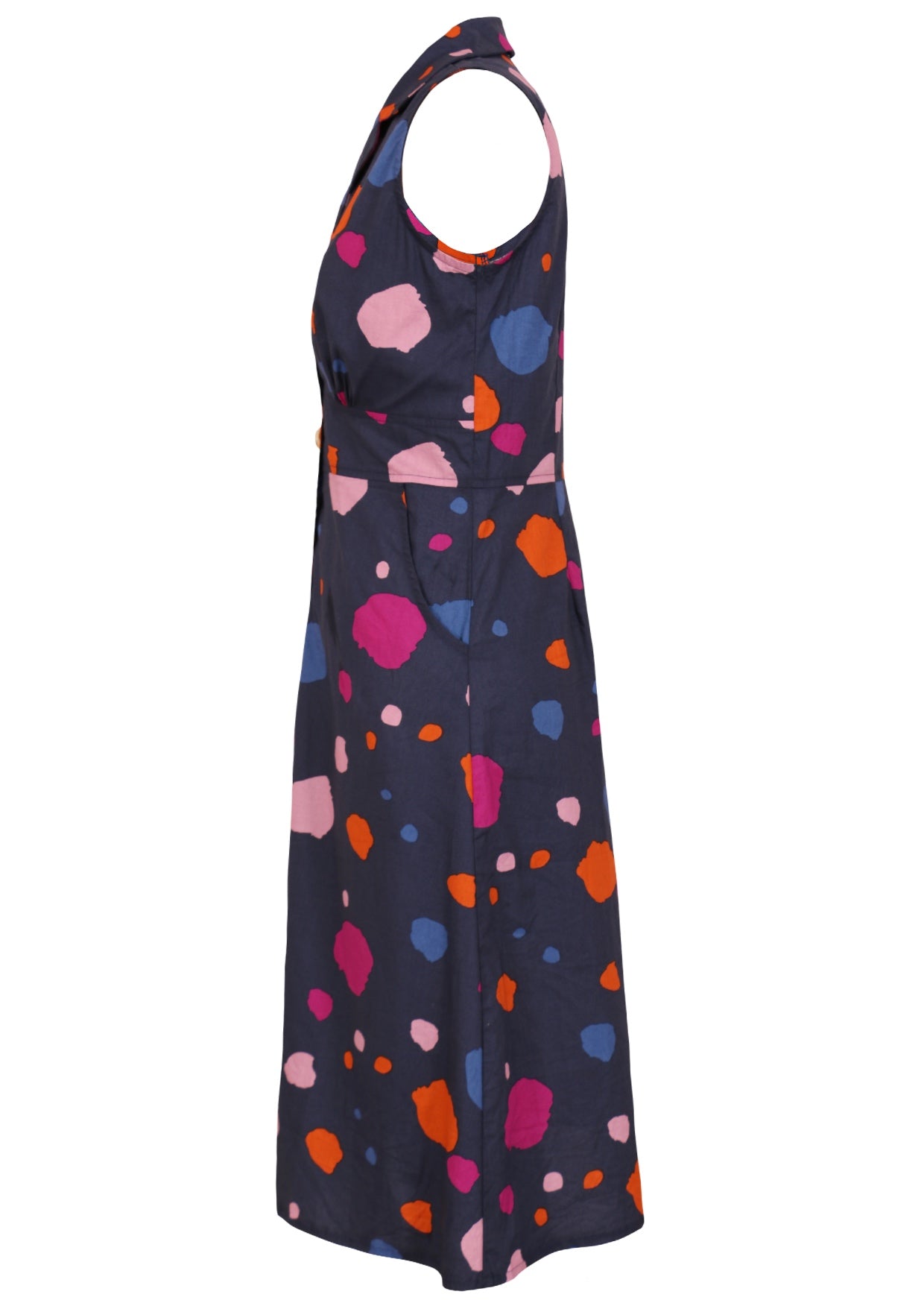 Charlie is our new, retro-inspired button-through sun dress, designed to bring timeless charm to your wardrobe. Made from 100 percent cotton, this sleeveless midi dress features the vibrant Dapple print, a lively mix of orange, pink, plum, and blue spots on a navy blue base. Charlie is a sleeveless, midi length dress, with a flattering collar, and convenient pockets. The skirt has an A-line shape, and the waistband is peaked in the middle front with small gathers under the bust, adding to a gorgeous silhouette with its fit and flare. Complete your outfit with sandals or dress it up with wedges, in a classic day-to-night move.