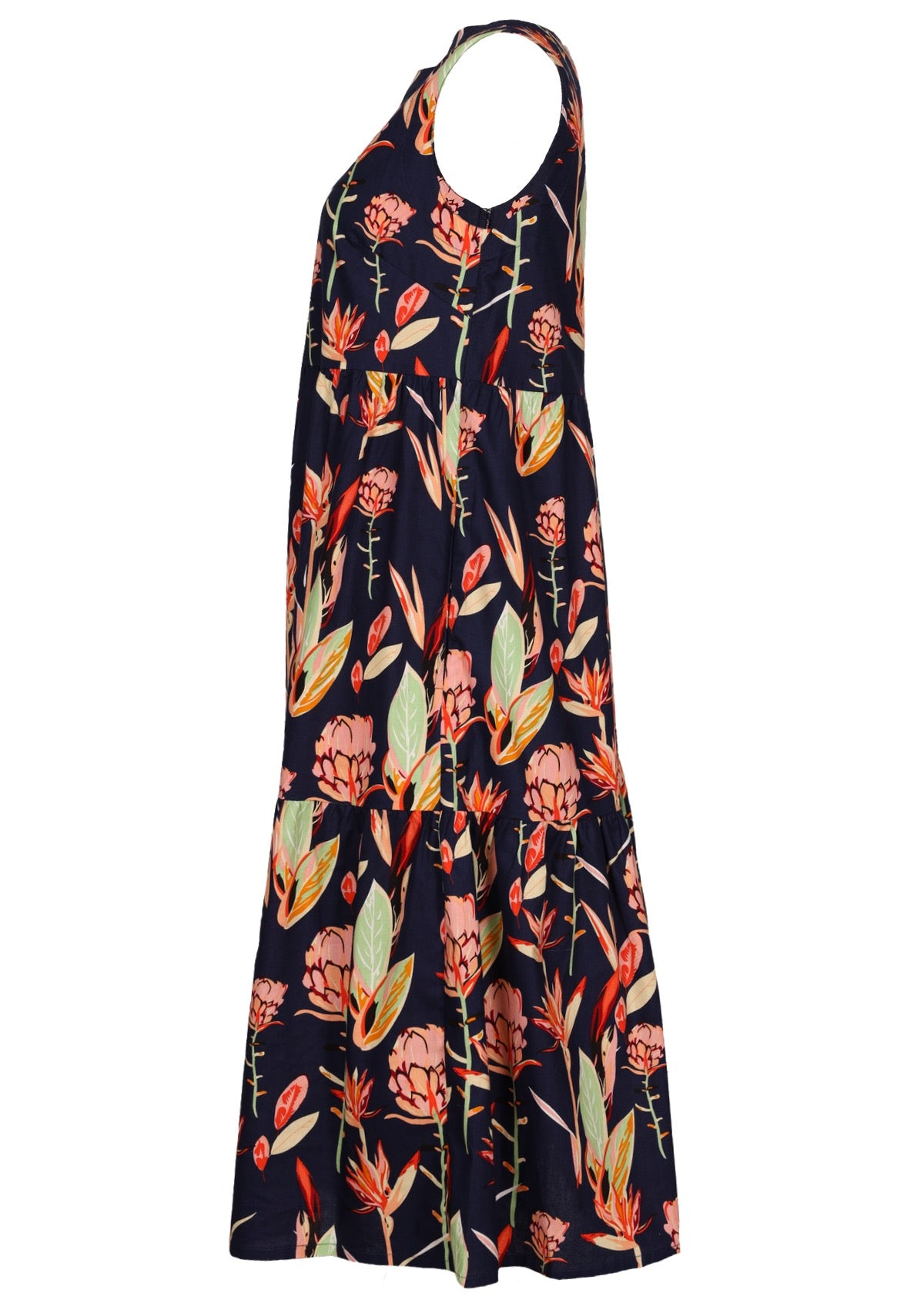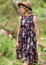 Harper, a three-tiered, sleeveless dress is a stunning addition to your wardrobe for all seasons. Made from breathable 100% cotton, it features our beautiful bold Bird of Paradise floral print with pink and green flowers on a navy blue base. The dress has a lovely relaxed fit, a high round neckline, keyhole button back closure, and POCKETS! Wear it with sandals in warmer weather or layer with a cardi, boots and tights, when it’s cooler. It can also be cinched at the waist with a belt for a flattering silhouette.